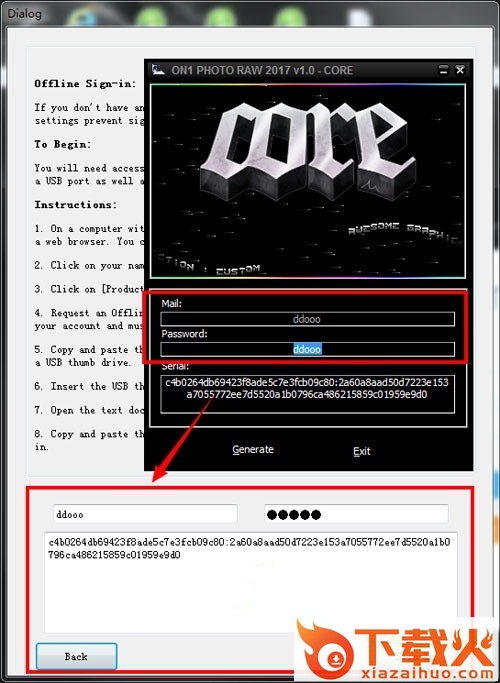 7、打开ON1 Photo RAW 2017注册机,输入任意“Mail”和“Passward”,点击Generate生成激活码,然后将其复制到注册界面,点击Sign-in即可完成