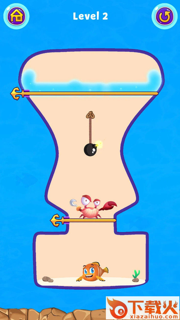 2、经典的拉针闯关方式,在这里按着顺序来使用拉针来救援小金鱼让其自由