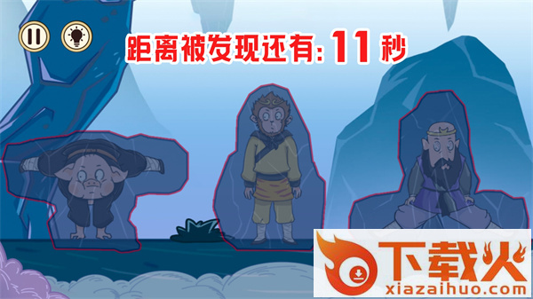 休闲解谜游戏,游戏中你需要帮助师徒三人躲过女妖怪的搜索才能顺利进到洞府去就出被抓走的师傅;点击人物切换不同的姿势来保证人物能完全躲在石头后面,开动你的大脑好好思考如何才能躲过去吧!