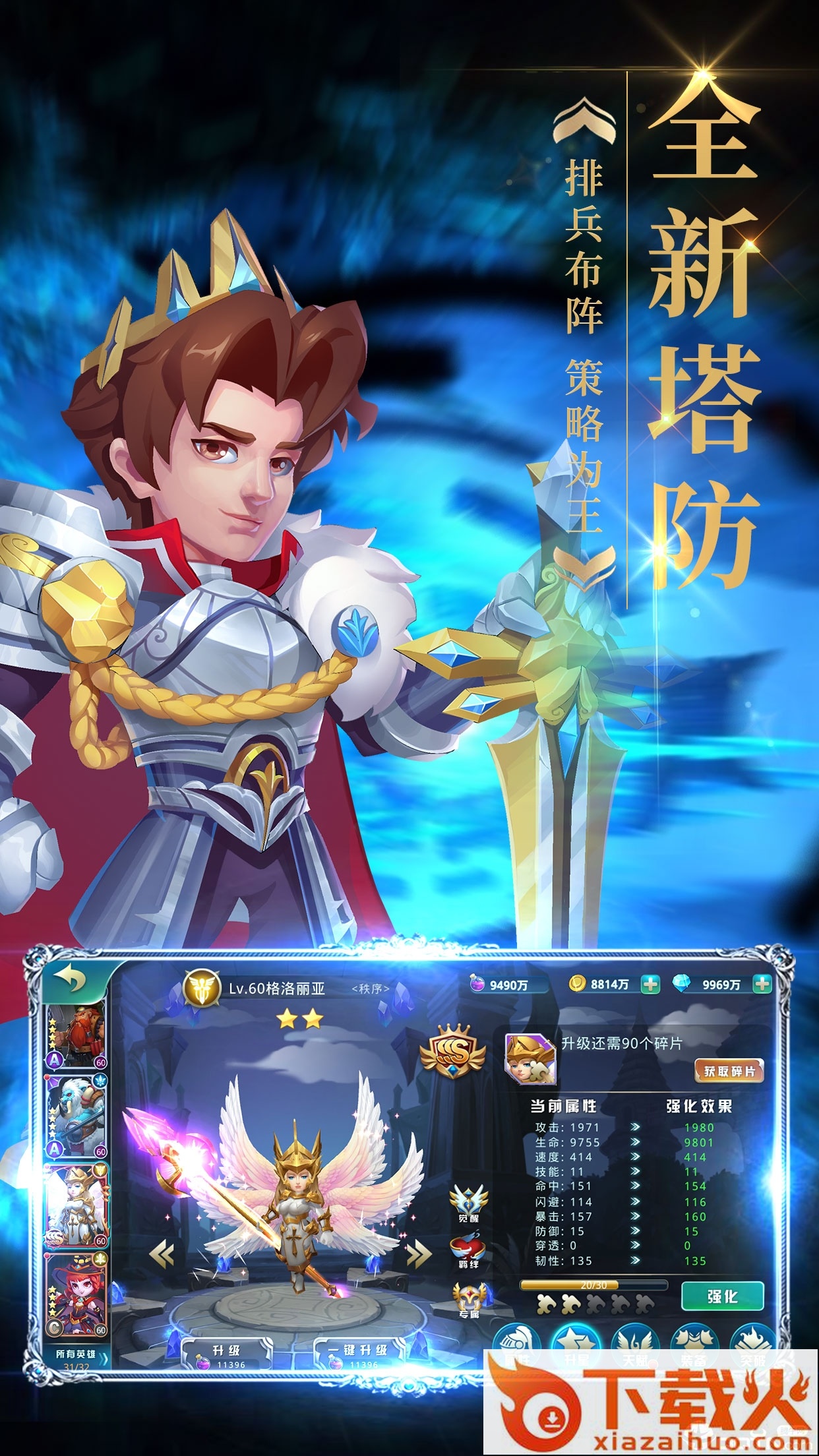 1.多格不同的英雄人物收集,不同的英雄有着不同的属性和技能,可以自由进行配合,让战斗力更加的强大。