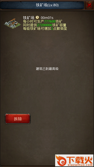 铁矿场:资源型建筑,在城外空地块上建造,建造需消耗资源,建造有等待时间,消耗钻石可以秒掉等待时间,升级&建造建筑等待过程中需占用1个空间,空间=建筑位,升级资源不足时,允许直接使用钻石替代资源进行升级操作。