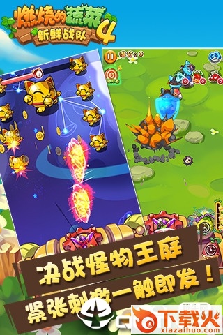 燃烧的蔬菜4新鲜战队是燃烧的蔬菜系列,也是一款休闲益智类手游。玩家需要设定固定的战斗装备以及练习弹射技巧,抵御敌人和入侵,保卫它们的蔬菜水果家园。
