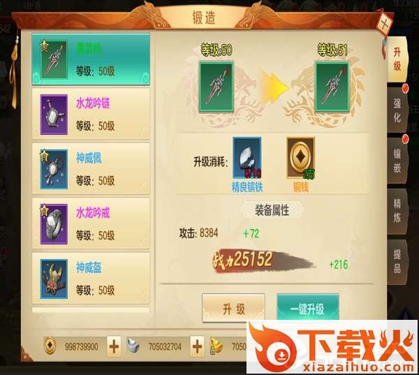 少侠可以对消耗一定数量的铜钱和镔铁对特定部位的装备进行升级,可以提升的等级最高不能高过人物的等级,更换装备不会影响该部位等级数。强化用的镔铁可以通过在修炼系统中分解武功秘籍获得,也可以通过副本和商城购买获得。