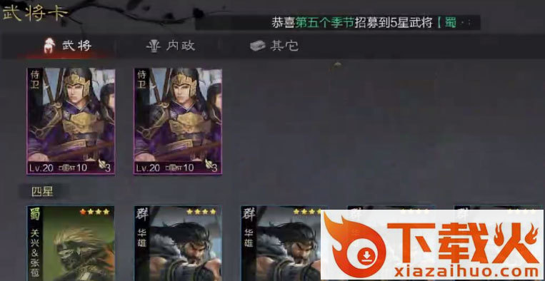 3、点击招募,招募之后会有武将的星级和名字,可以在武将的卡牌列表看到武将的等级还有全部武将,如果星级太低或者不合适在考虑转换掉,招募还可以在武将列表中选择特定的武将进行招募。