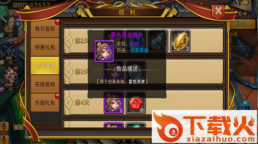 游戏会不定时举办一些活动,像常见的开服活动及媒体礼包等,当中一些会有包含招募英雄的材料。像游戏中的7天签到活动,就可以获得雾色贤者(紫色品质)的所有招募材料,非常给力的一位英雄。