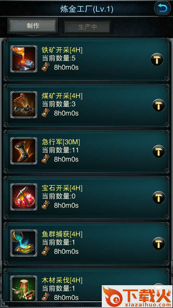 在炼金工厂中,玩家可以根据自己的稀缺资源,选择相应的项目进行制作,如缺少铁矿资源,那么选择“铁矿开采”进行制作无疑是最有价值的。