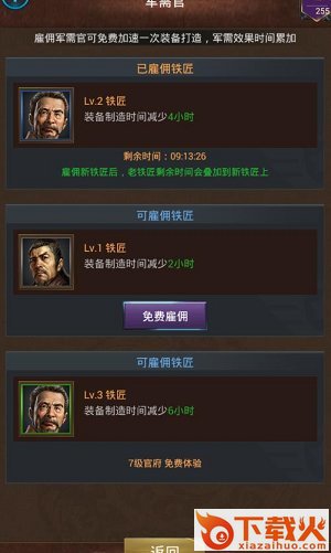 另外,铁匠铺还有雇佣铁匠的功能,雇佣铁匠可以大量加快装备的制造速度。雇佣时间结束,铁匠将离开。铁匠铺的等级越高,所能雇佣的铁匠等级越高。