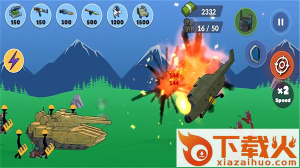 游戏采用了经典的火柴人造型,有武装直升机、步战车、火箭车等装备武器;