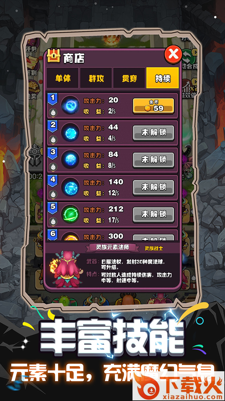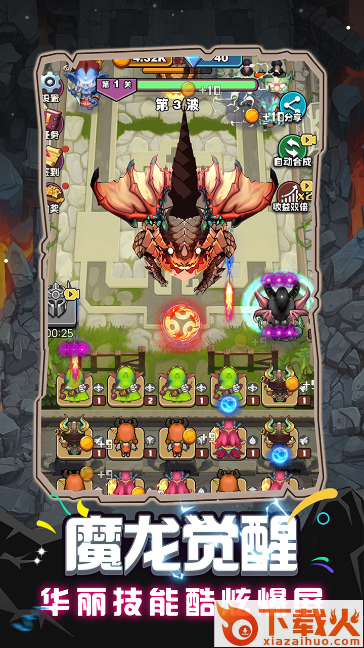 生产或者合成的小兵可以用来抵御敌人的攻击,也可以在杀敌时获取金币和钻石收益。消耗钻石可以召唤各种魔兽英雄来参战,用华丽炫酷的技能横扫敌人。休闲放置、轻松升级、炮塔合成、强力卡牌,最好玩的玩法这里都有!
