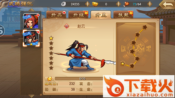 武将升星:通过消耗武将同名碎片以及部分金钱进行武将升星,升星后武将属性将大幅度提升,同时会解锁更高级的技能。