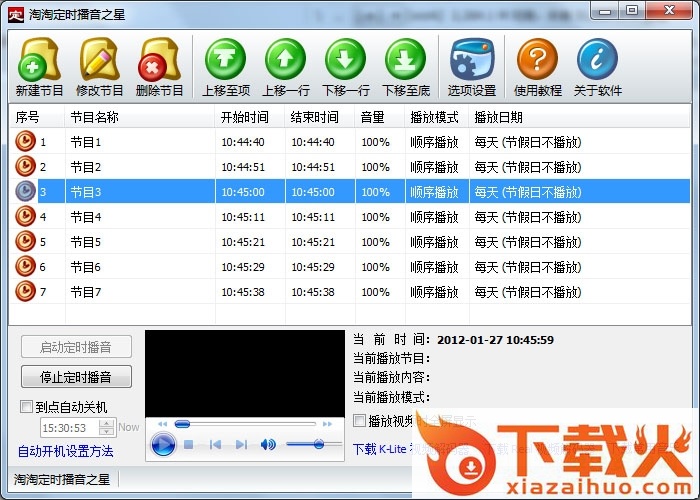 淘淘定时播音之星是一款不错的定时播音软件。可以作为商城、校园等场所定时广播使用。提供顺序播放、随机播放、循环播放等模式。用户可以自定义设置好播放时间,还可以支撑视频全屏播放。是款简单易用的广播定时播放系统。需要的用户快来绿色资源网下载使用吧。