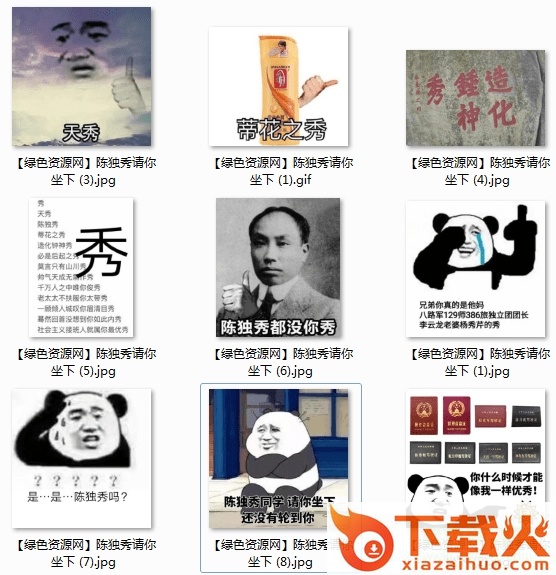在日常的聊天当中,总会遇到各种秀技术、秀操作、秀知识、秀恩爱的等等各种秀,所以就诞生了这个蒂花之秀、造化钟神秀等词语,就连伟大的陈独秀同志都不能幸免,像陈独秀都没你秀、陈独秀同志请你坐下等词语火爆网络,然后就有网友制作了这套表情,等有小伙伴向你秀的时候,就可以用这套表情进行反击。
