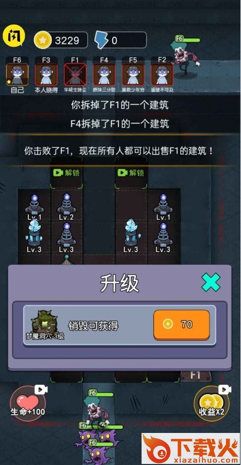 1、不断的升级自己的塔防保护自己的床,每一个玩家都有100血,每次被攻击扣除一滴,清零则失败。
