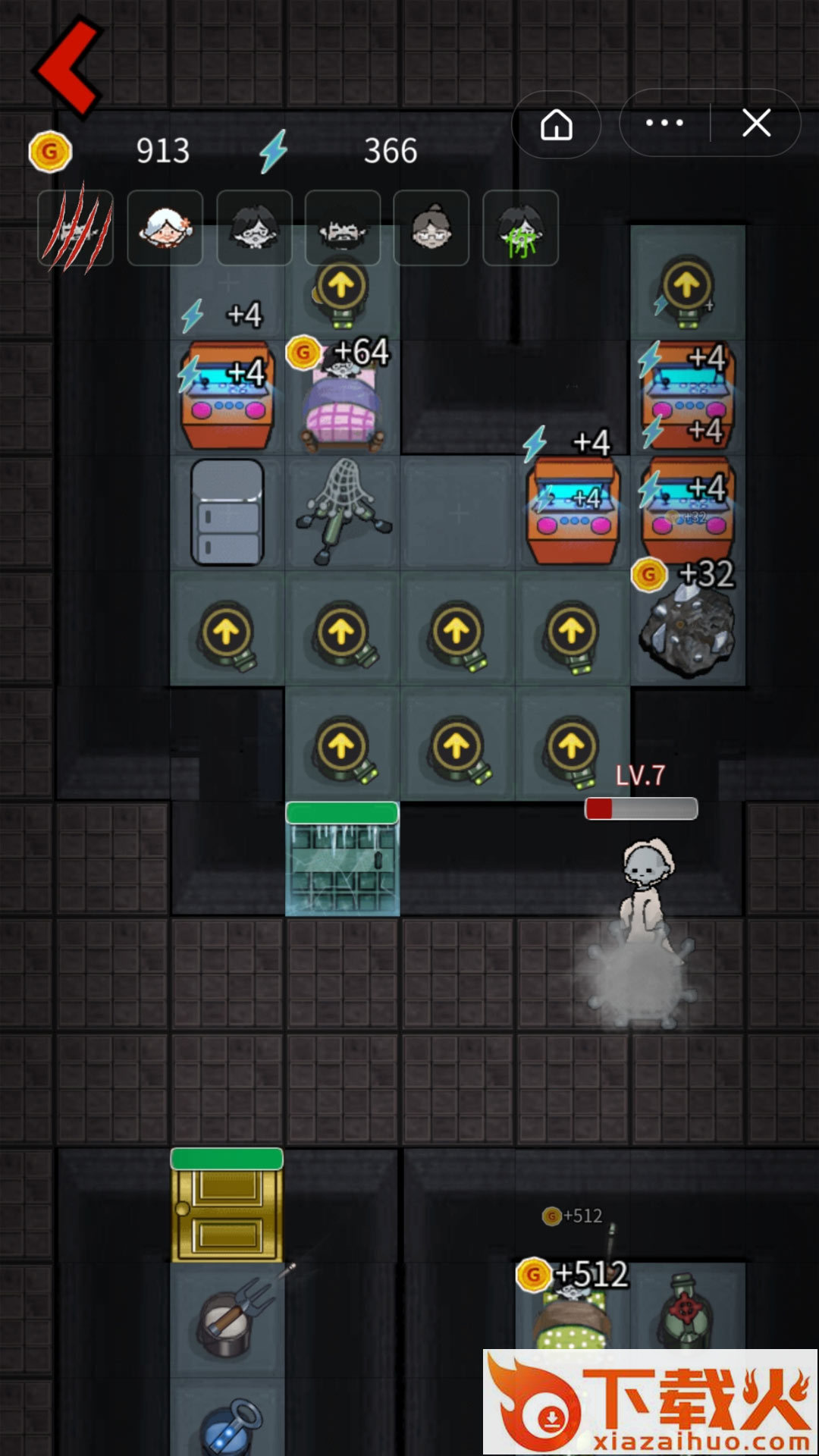 → 将床的收益升级到每跳+64 → 摆下4个维修台 → 升级游戏机到每跳+2 → 补出2个矿(一般铜矿)→ 考虑补炮塔 → 将门升级到钢门5
