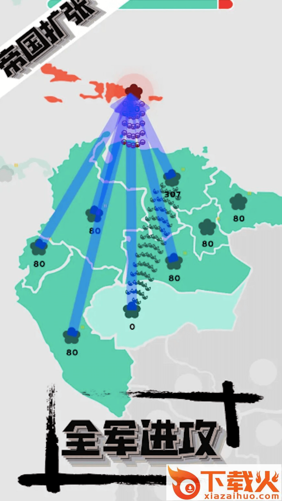 以扩张领土,收复失地为目标的战争策略经营游戏,在游戏中你将指挥士兵进攻敌方领土,防御我方领土。在战斗中时刻注意敌我士兵数量的变化,时刻观察敌方的动向,排兵布阵,找准时机一招制敌。切记,不要一味的进攻,前期发育和后期补给同样很重要!
