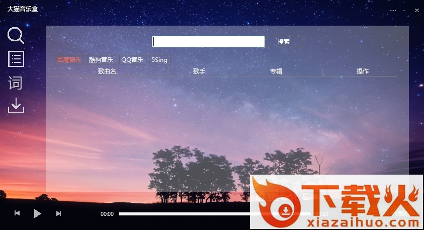 大猫音乐盒是一款好用的音乐搜索和播放软件,可以搜索、试听以及下载各大音乐网站的音乐,支持百度音乐、酷狗音乐、qq音乐和5sing音乐,非常适合喜欢听音乐的用户使用。