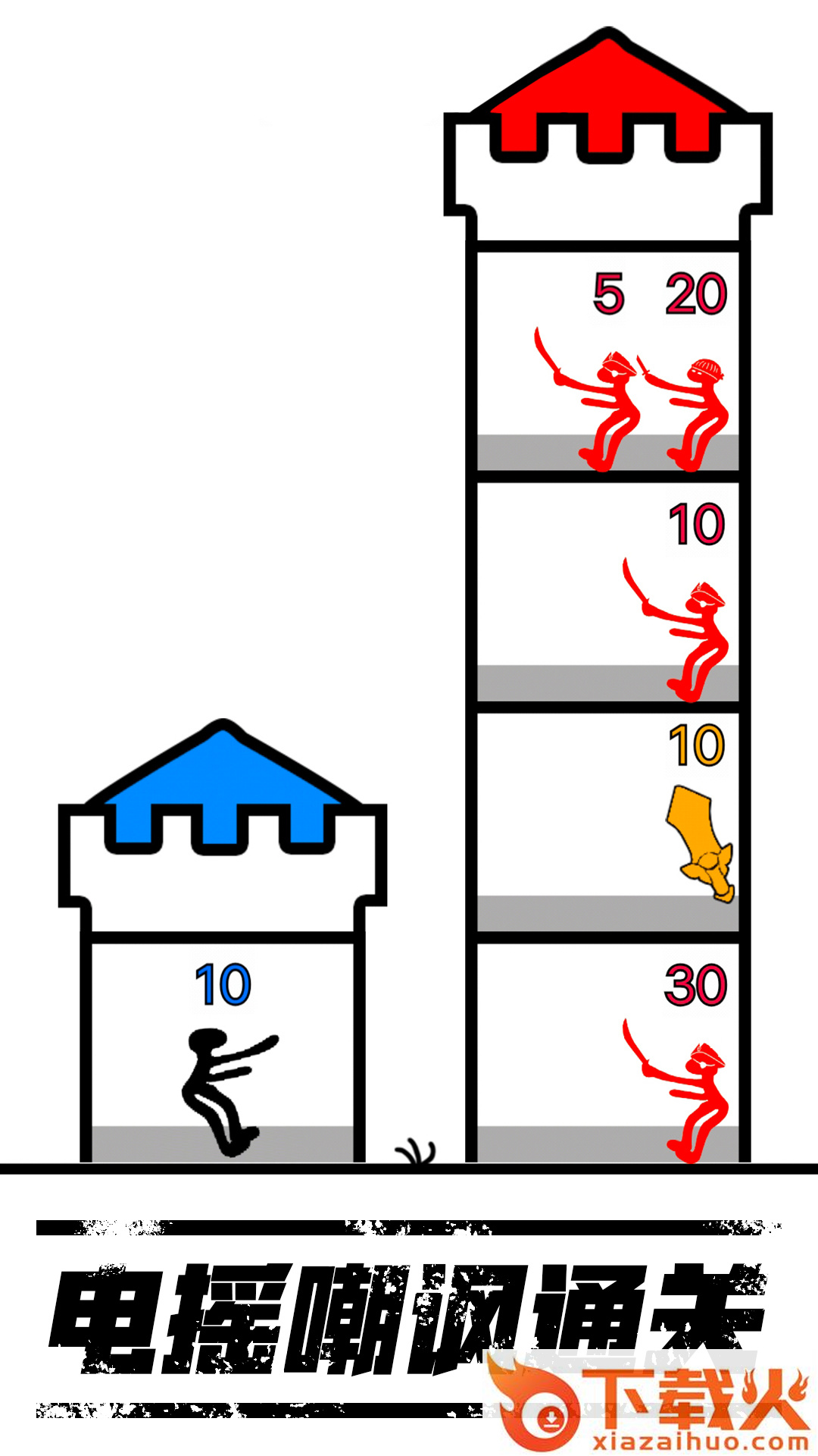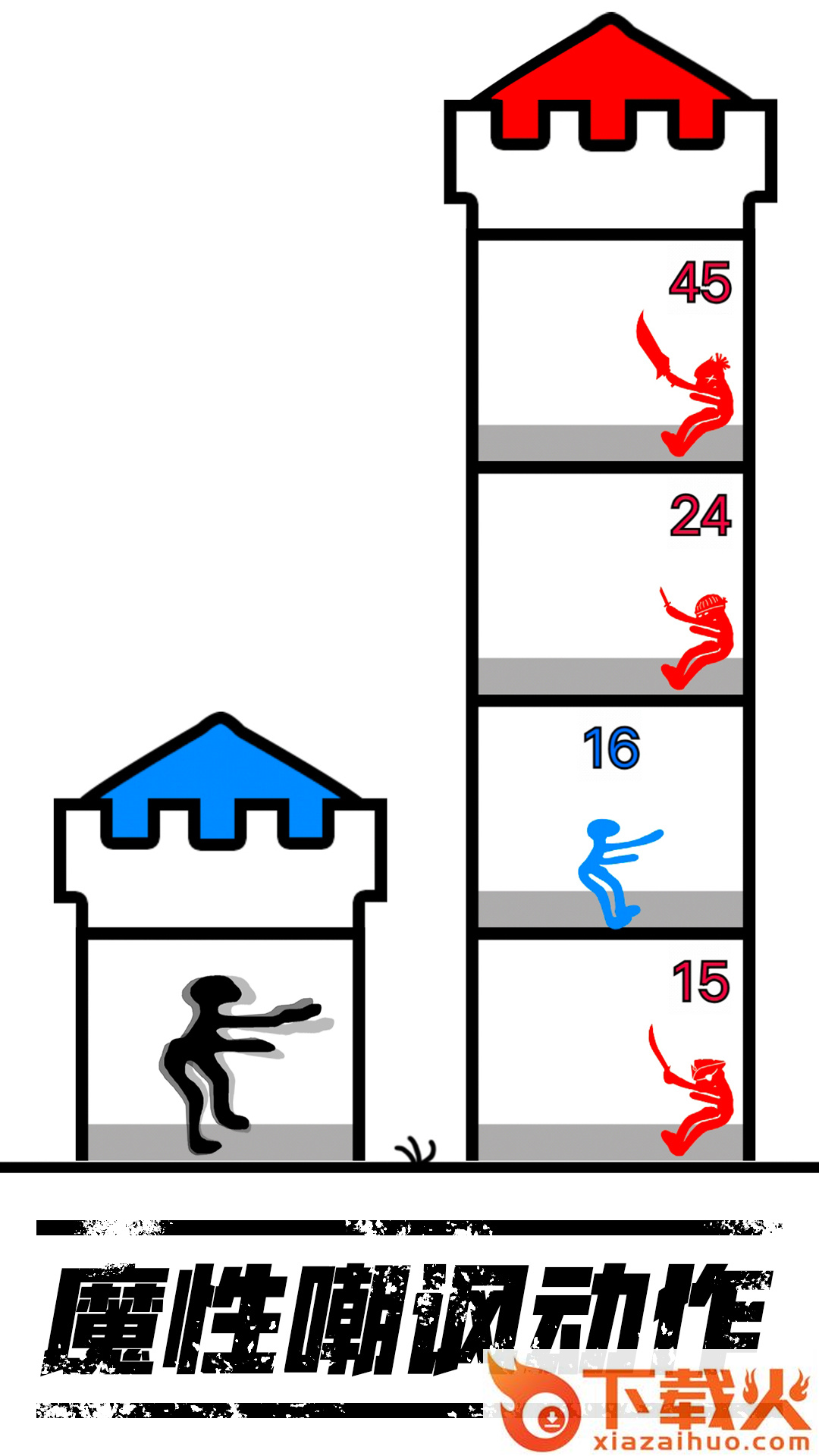 火柴人世界模拟游戏,一款集合爬塔战争的休闲小游戏。玩家操控你的电摇火柴人爬塔闯关,不断提升战力装备武器,对抗每层的BOSS,消灭各个塔楼boss,拯救公主。