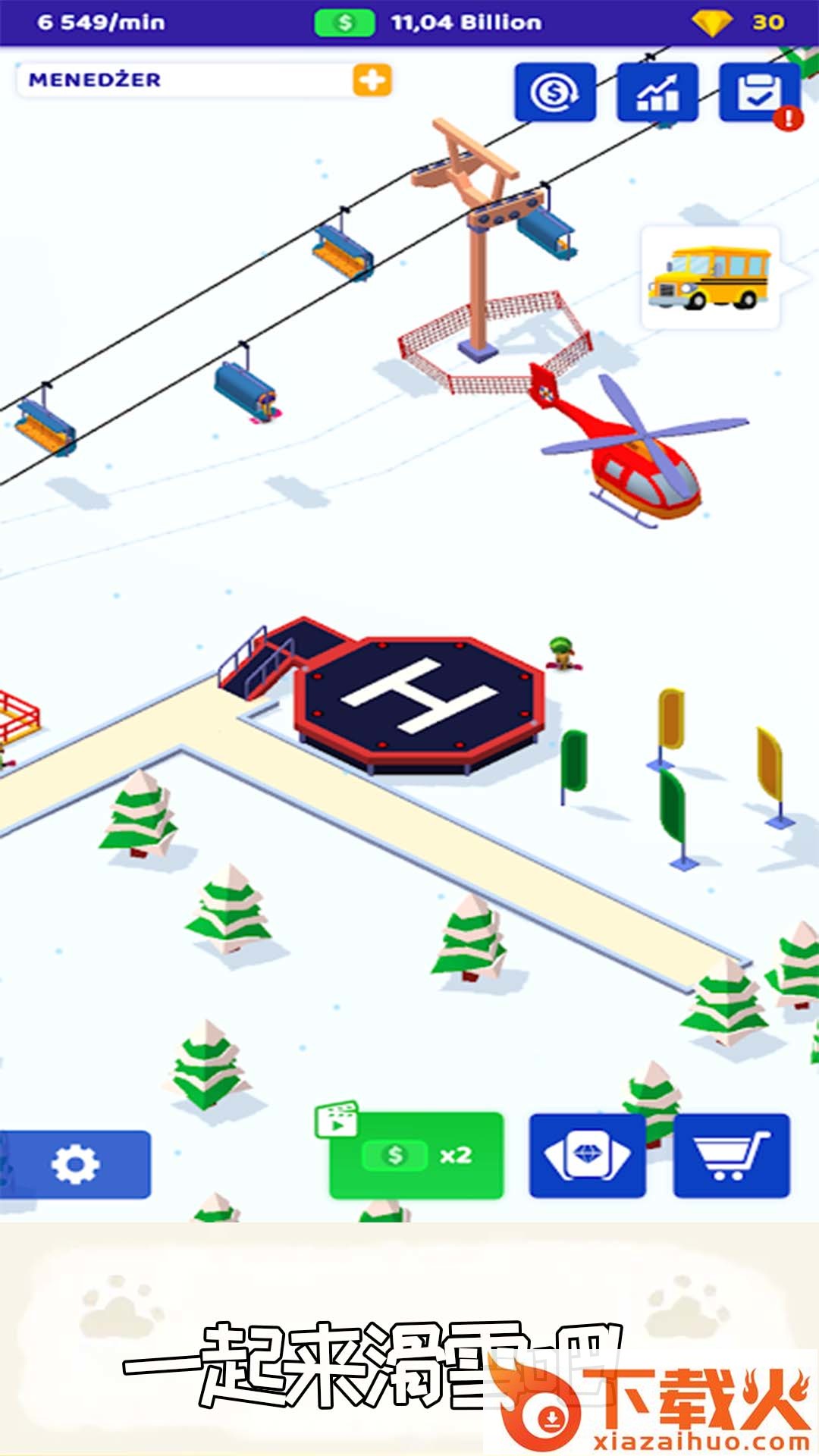 滑雪帝国,画质清新的滑雪场经营游戏。玩家作为滑雪场老板,建造滑雪场地设施,完善各个设施建筑,包含酒吧,休息室,游乐场,飞机场等等,吸引大波游客前来体验滑雪吧。
