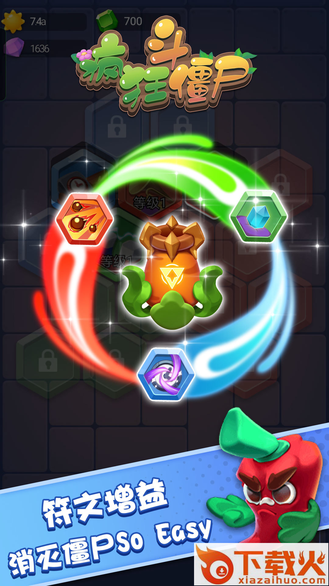 加快升级,获取符文碎片,解锁符文宝库!增加暴击率、金币掉落量up、提高攻击力、减少攻击间隔时间....镶嵌不同类型符文,增益效果max,消灭僵尸这不是分分钟的事!?