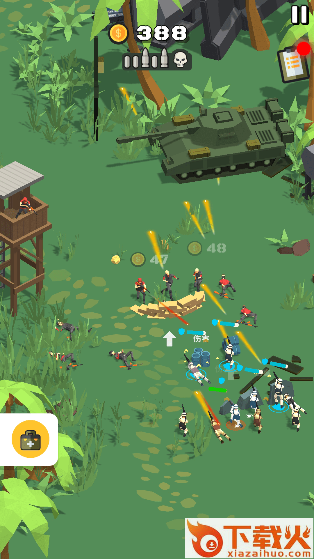 铁血士兵对决,卡通画风的战争策略游戏。玩家指挥召集各个士兵加入兵营,伐木采集建造营地,布置炮塔阵容,炮轰敌军,更大地图扫荡,完成你的战争。