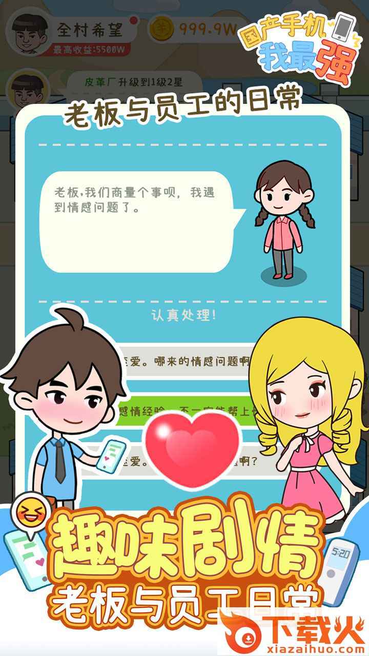 国产手机我最强游戏很有爱情的情怀呢,作为一名大学生,带领乡民们来制造手机,完成不可能的梦想,用国产手机来完成市场的逆袭,游戏非常的魔性烧脑,采用轻松的点击式经营玩法,包含非常多的内容。