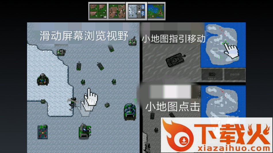 首先简单说明操作,点击单位是选择这个单位,快速双击某单位能选中屏幕视线类相同的单位,持续按住屏幕能以按住点为圆心,持续扩大半径,大范围选取单位,同时点击屏幕两点,能在两点间形成矩形对单位进行框选