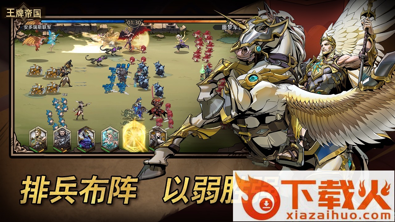 王牌帝国,全新策略卡牌大作。游戏模拟全新卡牌玩法,集合放置策略元素,解锁更多的卡牌抽取心仪英雄策略搭配阵容出战,更多的冒险副本解锁等你来挑战试试。