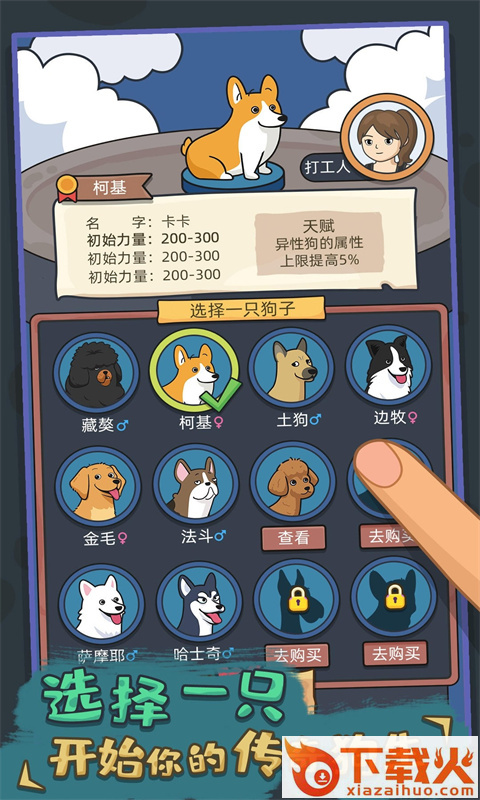 你好狗好喜欢,模拟狗狗生活的小游戏。文字+漫画的方式展示狗狗生活,从出生开始一步步成长提升各种属性,基因育种培育强大的狗狗,体验狗狗的一生吧。