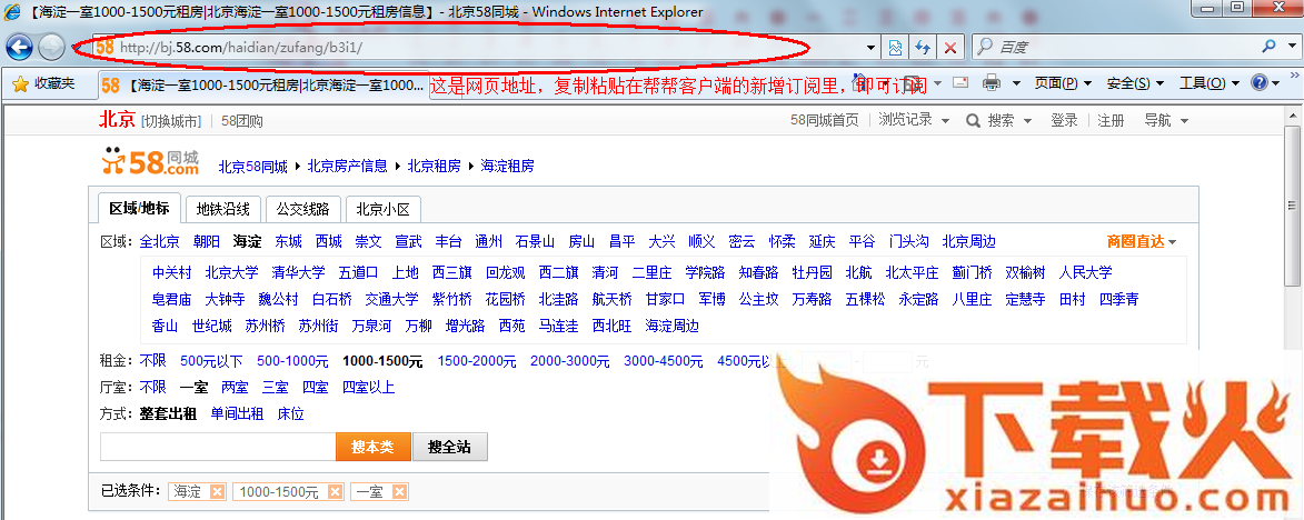 (增加新的订阅条件,需要现在58同城网站列表页筛选信息,比如选择“租房”“海淀”“一居室”,然后将网页的地址复制、粘贴在输入框里,最后点击“添加”按钮,即可增加一条订阅)