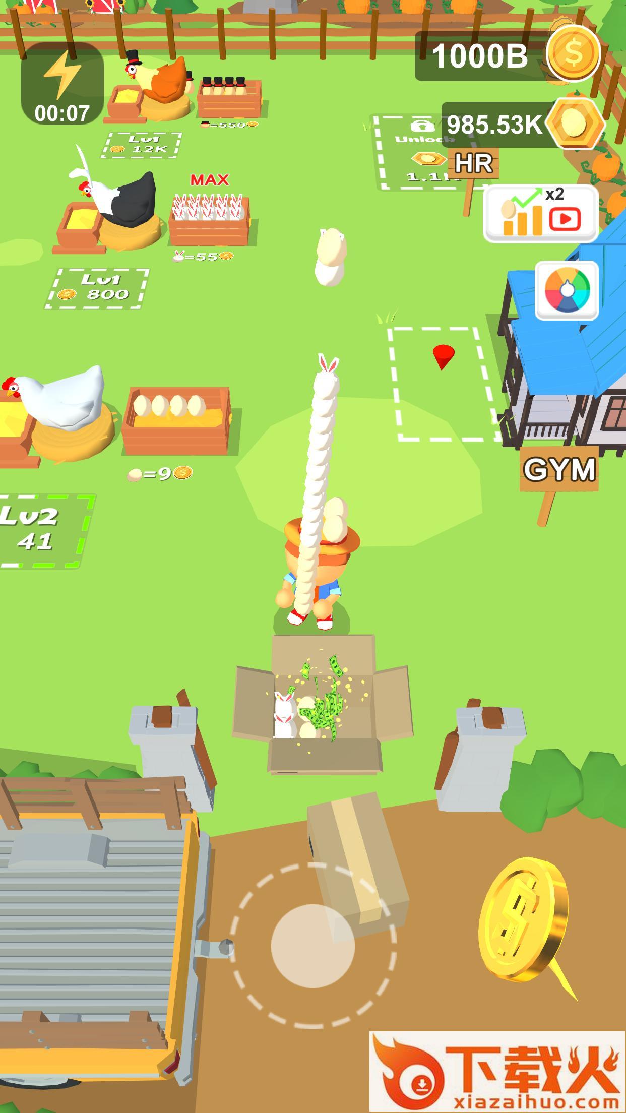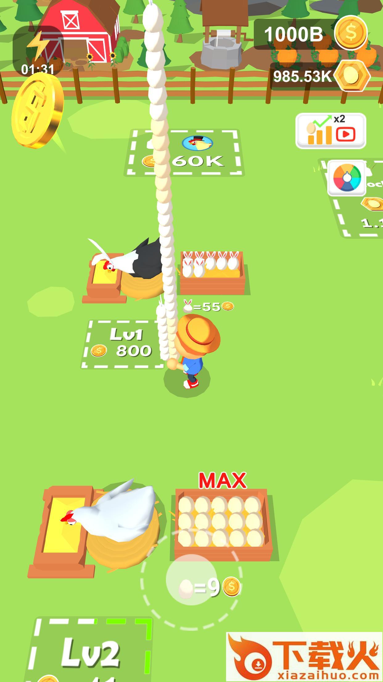你有一个小鸡蛋农场。你需要购买鸡,让它们下山,然后将鸡蛋运到卡车上,卖掉它们以获得收入。您可以继续升级鸡的质量,使它们生产的鸡蛋更有价值。当您积累了足够的钱时,您可以购买新鸡来生产不必要的鸡蛋。您还可以雇用工人来帮助您处理这些事情。