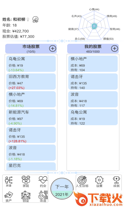 在游戏里面你需要不断的通过炒股来赚钱财富,从而维持家庭开支,生活不会一帆风顺,你还要处理家庭和生活上的琐事!快来这里展现你的实力吧~