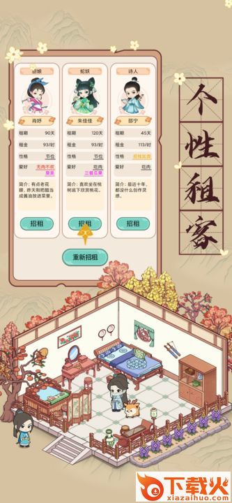 古代收租日记,画风唯美的古风模拟当房东游戏。开局回到古代拥有一栋楼一条街,招租接待各个商铺和客人,装修升级店铺,发展你的房屋街道,一步步升级,模拟收租的乐趣。