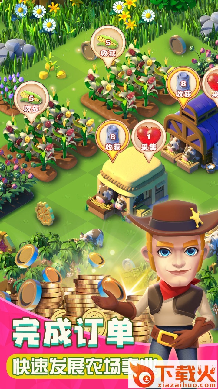 之后还可以喂养它们收获鸡蛋,牛奶。收集农产品完成订单你就能获得更多金币来购买更多物品,或者获得经验来提升等级。