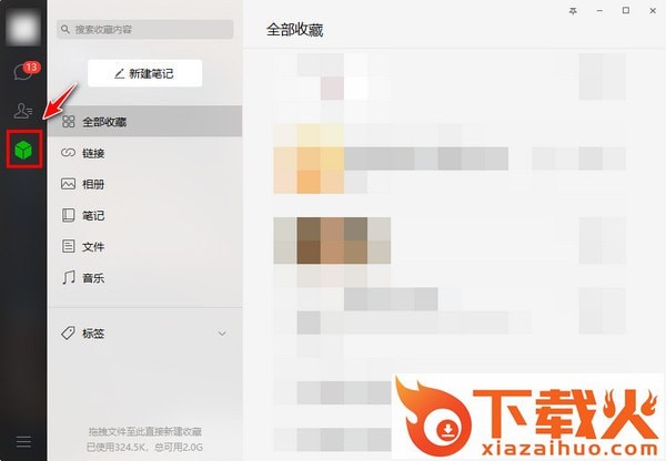 微信2.0 for Windows版本新增收藏功能,登录Windows微信后->点击微信左侧“收藏”功能键。点击收藏内容随时看,也可以创建笔记,和手机端收藏相互同步。