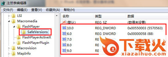 b. 将 "HKEY_LOCAL_MACHINE\SOFTWARE\Macromedia\FlashPlayer\SafeVersions" 内的值删除(保留默认值)如下图所示。