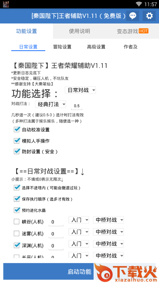 王者荣耀秦国陛下挂机辅助是一款游戏工具,针对于安卓用户的玩家,主要是帮助玩家实现无人值守可以挂机可以刷金币的功能,在你无论上班上学的时候可以实现王者荣耀挂机自动打刷金币的收获,一举两得喜欢的朋友快来腾...