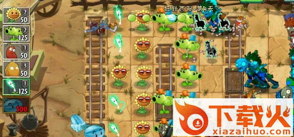 此时当你看到阳光够种一个冰西瓜投手时,将其种在最后排的矿车上。把这个当成一个控制类植物就好,然后上下移动矿车,投出的西瓜会造成3×2范围的冰冻减速效果,注意躲避从后方袭来的僵尸,然后让双向来解决后方的僵尸。