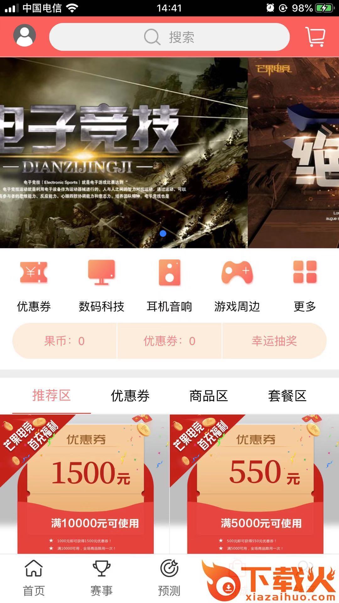 芒果电竞是一款资讯类电竞APP,主要包含了首页、赛事、预测、商城和社区五大模块。
