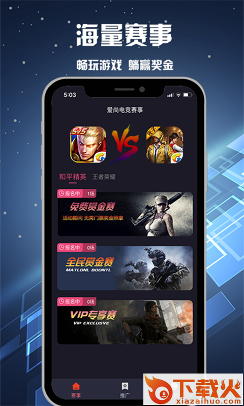 每天数千场比赛:赏金赛,福利赛,挑战赛等等,随时随地与好友一起开黑,开启您的电竞之旅。