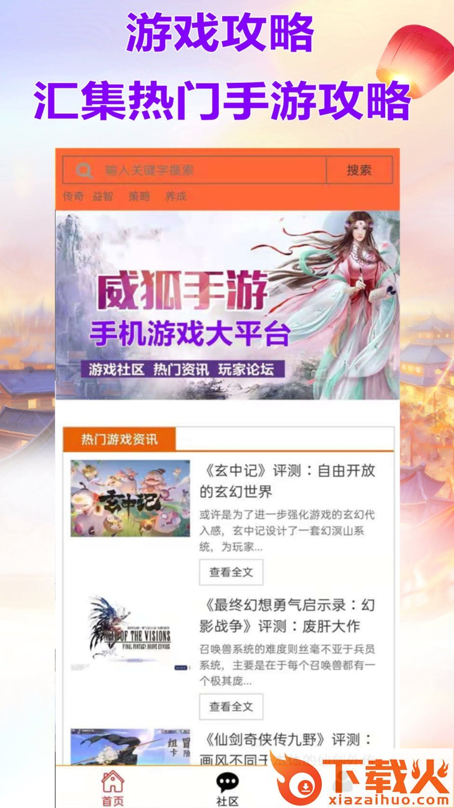 威狐手游app,汇聚大量优质资讯信息的手游社区,热门游戏资讯、游戏排行、游戏测评、玩家论坛等内容尽在其中,为你推荐各种好玩游戏,享受更优质的游戏服务。...