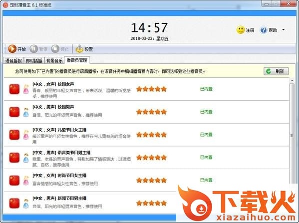 定时播音王软件是一款能够为用户提供按时播音功能的软件,丰富的播音系统为用户的使用带去更多的方便,同时软件中还可以为用户提供播音内容的编辑,需要的用户快来绿色资源网下载吧!