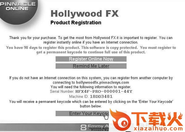 1、先根据提示先安装英文版,安装 Hollywood 4.58英文版时要求 输入序列号,输入HFX45-GLD-535744-85S,在最后出现激活号界面,要求输入激活码《ENTER KEYCODE》,如果在WIN7下运行那个注册机的话,总会提示序列号无效。不要着急,将序列号和机器号《Machine ID》记住先关闭窗口,完成安装。