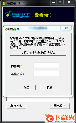 第二步,在另一台手机或电脑上运行“警猫眼”观看端程序,添加第一步的摄像端ID,即可连接。
