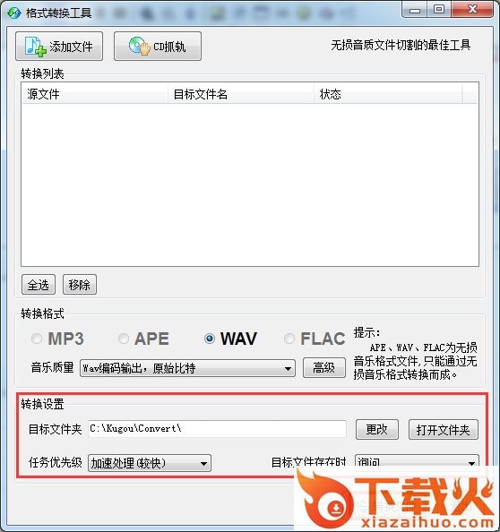 酷狗格式转换工具,酷狗可以下载无损音乐,但是无损音乐太大了,那么您可以使用这个转换工具,可以将无损音质文件切割,并将格式转换成mp3、ape、wav、flac等,支持设置任务优先级,是一个非常强大的音频格式转换工具。