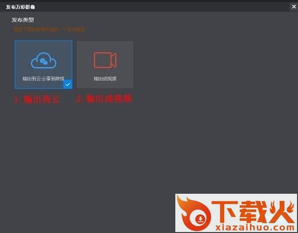 在发布界面, 您可以输出您的照片视频: 1.输出到云分享到微信。 2. 输出成视频。