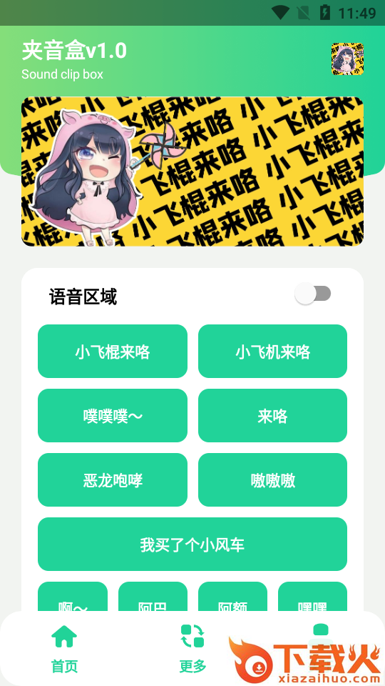 夹音盒app,全新恶搞语音盒子下载,收录了网络上一些经典火爆的语音,“小飞棍来咯”、“小飞机来咯”,“恶龙咆哮”等等,语音内容非常的丰富,点击就会发出恶搞声音。