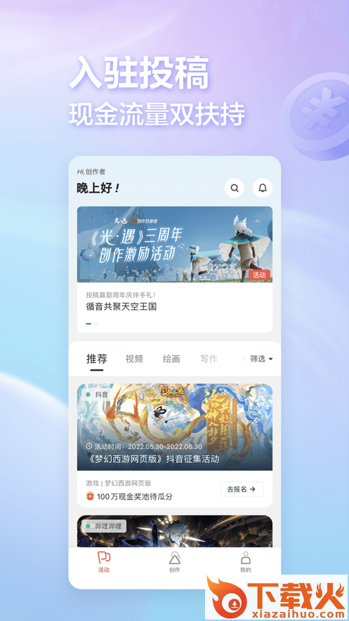 平台上有最新最全的创作征集活动,覆盖多款热门游戏和抖音、快手、西瓜视频、微博、小红书等媒体平台,快速参与创作投稿,快人一步抱走奖励!
