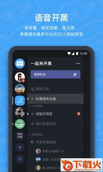 5、语音开黑:高质量、稳定流畅、低占用,单频道内最多可允许25人同时发言
