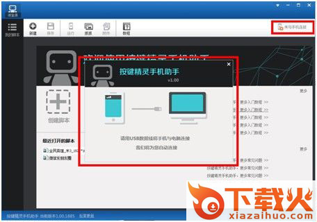 本版本为免安装,用户通过点击“按键精灵”手机助手,即可启动软件(PC端)进行体验。而安卓端,用户可通过第一次设备与“按键精灵手机助手”进行连接(USB插入设备至电脑,点击软件界面右上角图标接口进行连接如图3),安卓端程序将自动安装至设备内。也可通过文件夹apk内的MobileAnjian.apk,进行安装。