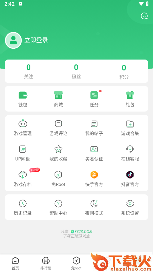 7723游戏盒一款实用的手机游戏下载工具软件,包含了游戏下载,社区互动,UP资源,有趣工具等多种不同功能,同时有攻略礼包,好友聊天,赚取每日积分兑换等特色;